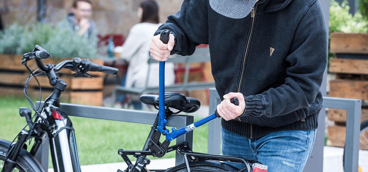 Eine Person versucht, mit einem Bolzenschneider das Schloss eines Fahrrads zu knacken. © itsmybike.com | pd-f