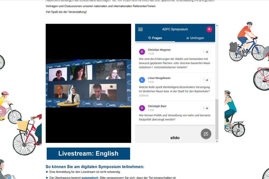 In der Spitze schalteten über 1.000 Zuschauer*innen die Internetübertragung des ADFC-Symposiums unter dem Titel „Innovationen für den Radverkehr – Internationale Best Practices für lebenswerte Städte“ ein. Diese große Resonanz zeigt, wie groß das Interesse an dem Thema ist, an dem die Projektgruppe des ADFC zwei Jahre lang gearbeitet hat.